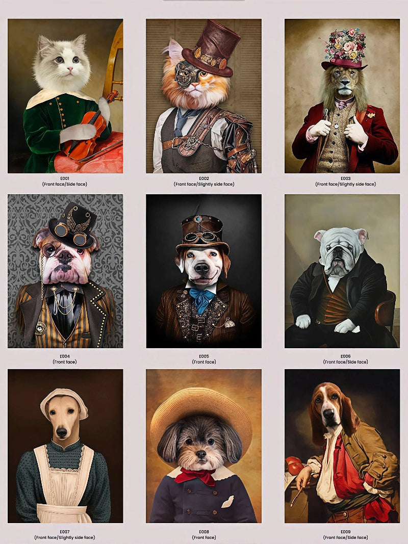 Turning your photos and imagination into a breathtaking, one-of-a-kind oil painting. Can't decide on just one style? Our Custom Pet Portrait Gallery is your creative playground! Whether you envision your pet as a historical figure, a fantasy hero, or simply their adorable self in a classic masterpiece, our artists can bring any idea to life.